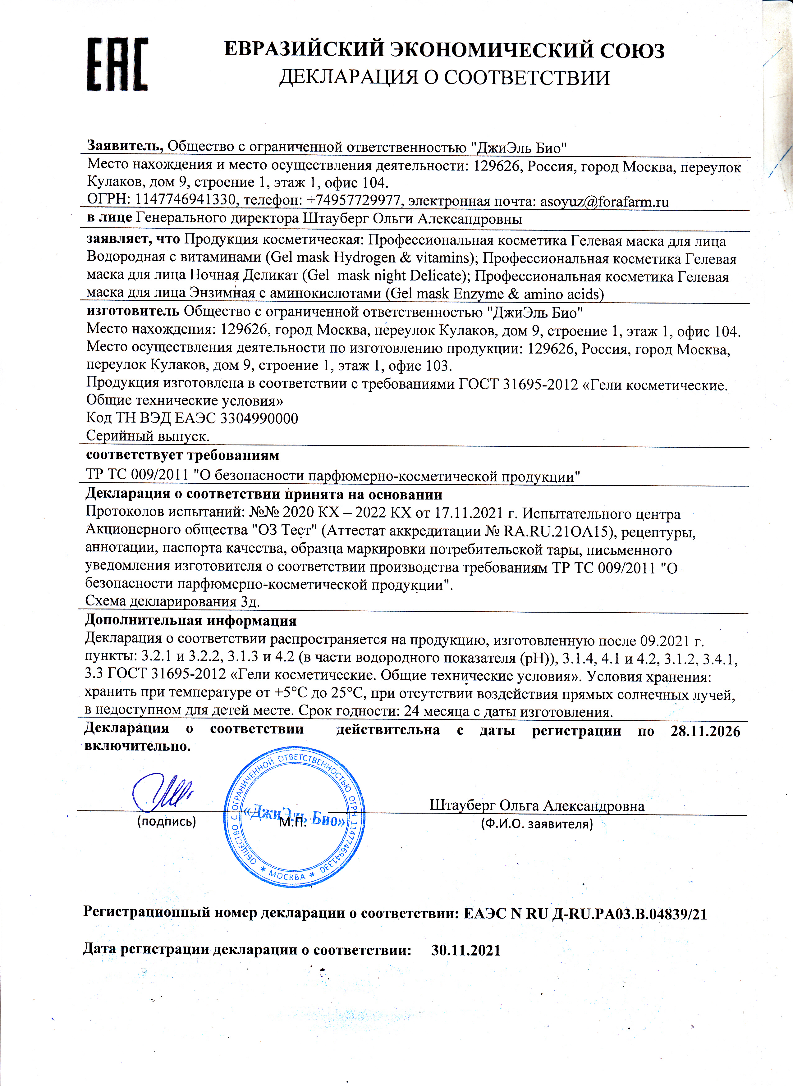 Рекомендации по применению: нанести гелевую маску на предварительно очищенную кожу лица, шеи и зону декольте плотным слоем, избегая область вокруг глаз, оставить на 10 минут, затем тщательно смыть водой. Используйте маску 2 раза в неделю.