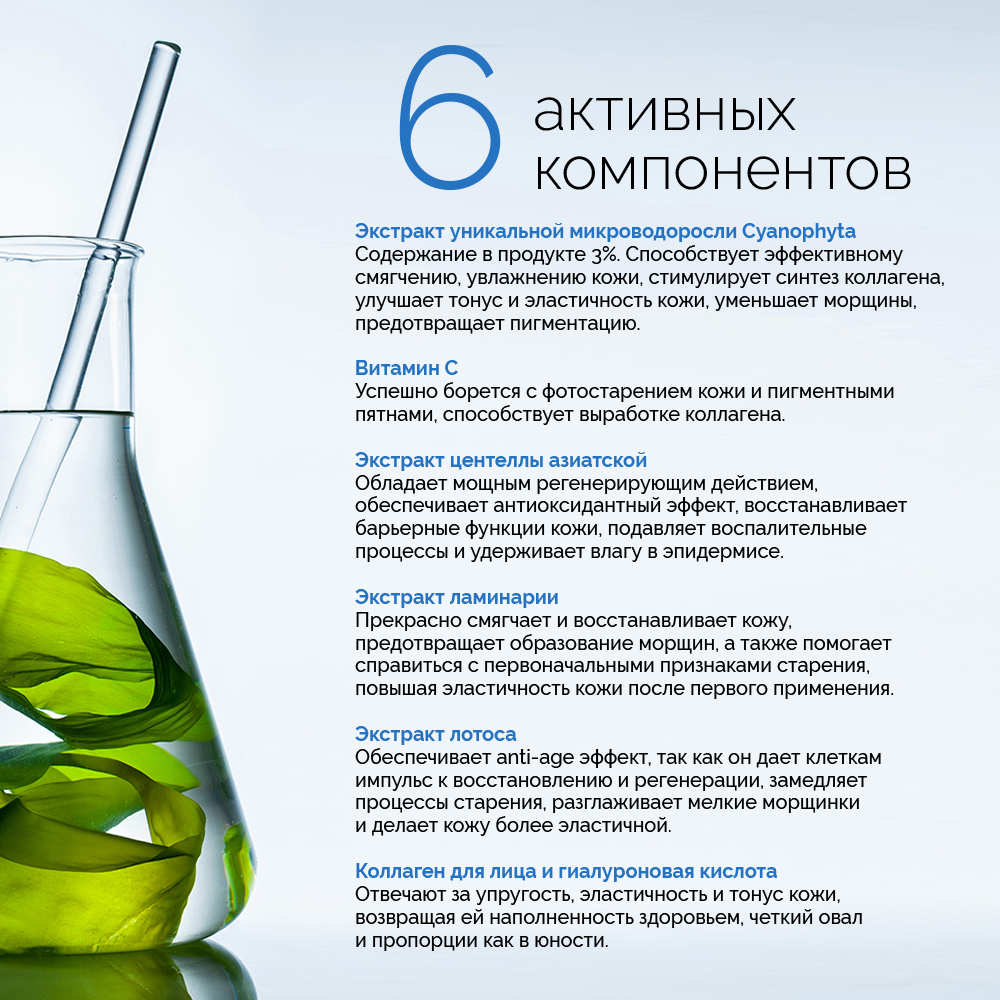 Экстракт уникальной микроводоросли Cyanophyta восстанавливает клеточную структуру кожи, влияет на внутриклеточные процессы окислительного стресса (обеспечивает антиоксидантную защиту) и усиливает синтез коллагена. Уменьшает морщины, разглаживает рельеф кожи и предотвращает пигментацию.