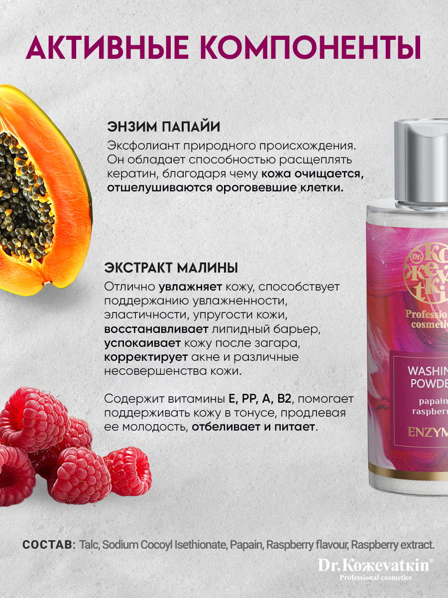 Легкая мелкодисперсная Энзимная пудра с экстрактом малины идеально подходит для глубокого очищения кожи, особенно для жирного и комбинированного типа. Интенсивно очищает поры от загрязнений, нормализует работу сальных желез, нейтрализует черные точки, уменьшает интенсивность и размер пигментных пятен, выравнивает микрорельеф кожи, удаляет остатки макияжа, матирует и осветляет кожу. Энзим папайи действует как увлажняющий компонент с легкой эксфолиацией, оптимизирует водный баланс эпидермиса, способствует лимфодренажу, устраняя застойные явления. Экстракт малины содержит витамины Е, РР, А, В2, помогает поддерживать кожу в тонусе, продлевая ее молодость, отбеливает и питает.