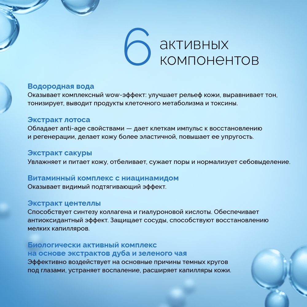 Водородная вода оказывает комплексный wow-эффект: улучшает рельеф кожи, выравнивает тон, тонизирует, выводит продукты клеточного метаболизма и токсины.