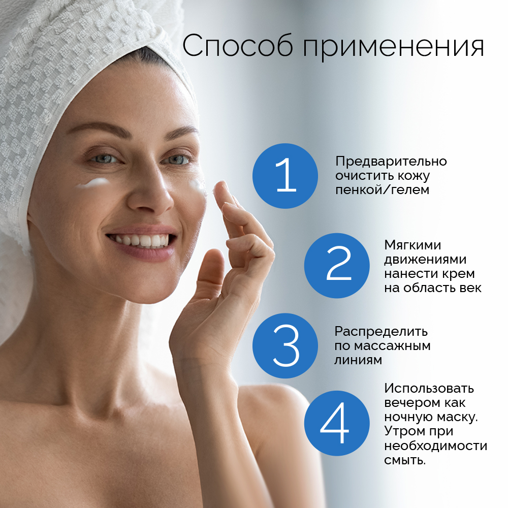Рекомендации по применению: легкими массирующими движениями нанести небольшое количество крем-патча на кожу вокруг глаз. При необходимости – смыть водой.