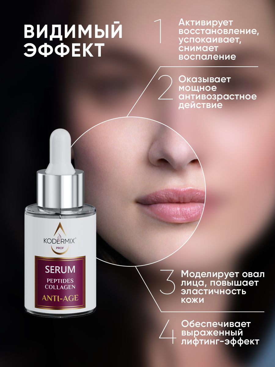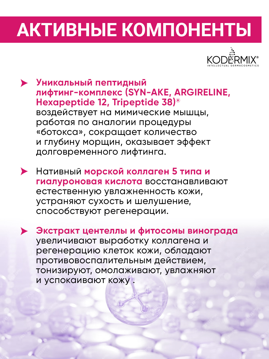 Сыворотка с высокой концентрацией инновационных активов обеспечивает видимый лифтинг-эффект, активно увлажняет, освежает, подтягивает контуры лица и разглаживает морщины, оказывает мощное антивозрастное действие. Уникальный пептидный лифтинг-комплекс (SYN-AKE, ARGIRELINE, Hexapeptide 12, Tripeptide 38) воздействует на мимические мышцы, работая по аналогии процедуры «ботокса», сокращает количество и глубину морщин, моделирует овал лица, повышает плотность и эластичность кожи, оказывает эффект долговременного лифтинга. Нативный морской коллаген 5 типа и гиалуроновая кислота восстанавливают естественную увлажненность кожи, устраняют сухость и шелушение, способствуют регенерации, сглаживанию рельефа кожи и уменьшению видимости морщин. Экстракт центеллы и фитосомы винограда успокаивают кожу, снимают воспаление, обладают антиоксидантными свойствами, блокируют воздействие свободных радикалов, защищают от фотостарения.
