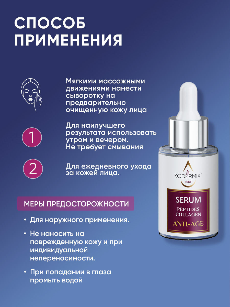 РЕКОМЕНДАЦИИ ПО ПРИМЕНЕНИЮ: мягкими массажными движениями нанести сыворотку на предварительно очищенную кожу лица. Для наилучшего результата использовать утром и вечером. Не требует смывания.